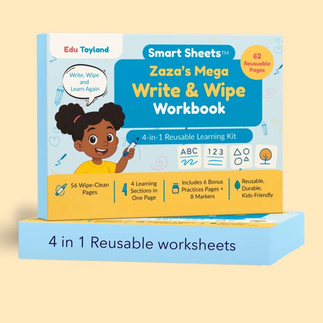 Make learning fun, interactive, and stress-free with Zaza’s Mega Write & Wipe Workbook! This 4-in-1 reusable learning kit is designed to help children practice letters, numbers, shapes, and everyday skills — while enjoying the freedom to trace, erase, and try again.