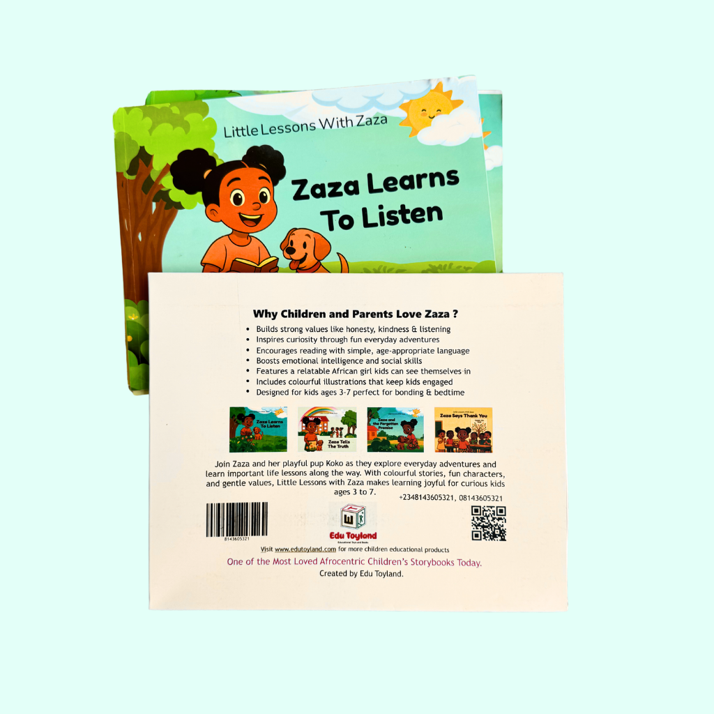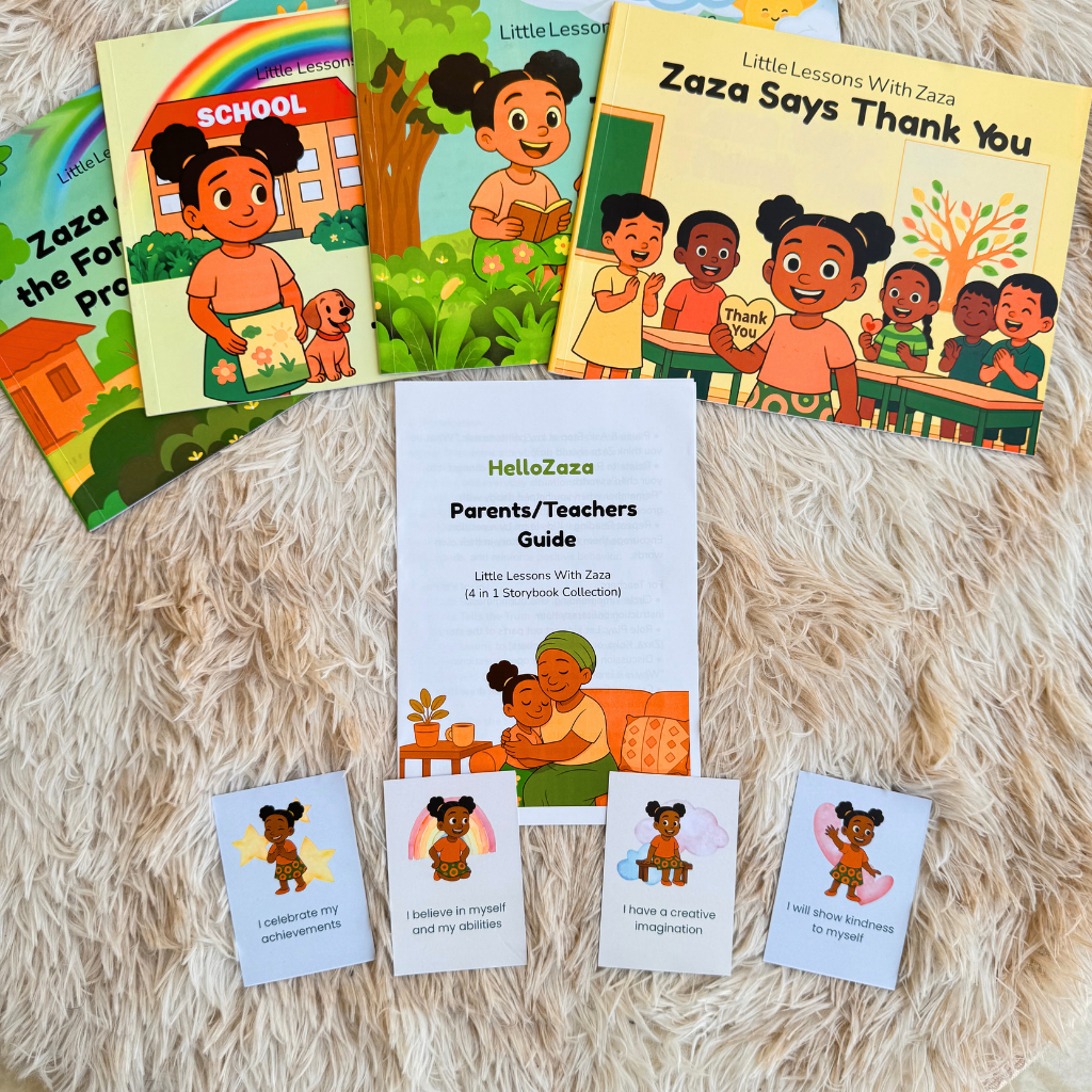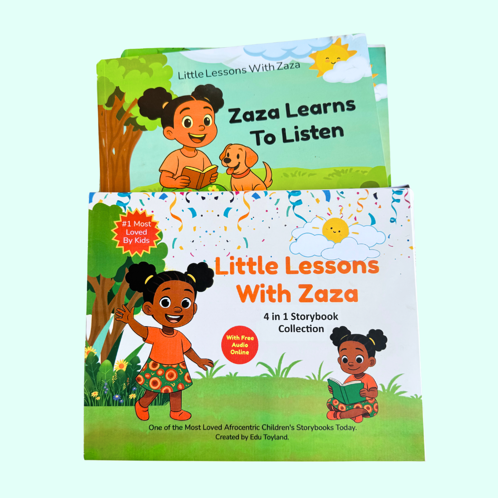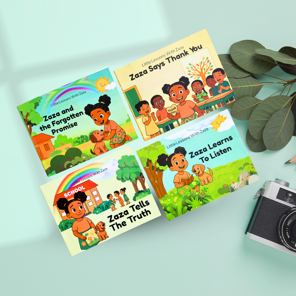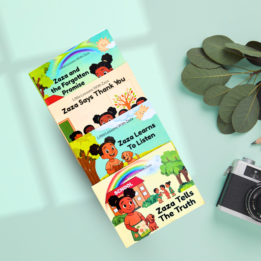 The Little Lessons with Zaza Storybook Collection includes four beautifully illustrated 10×8 landscape books, each filled with vibrant Afrocentric characters and engaging stories designed for children ages 4–7.
