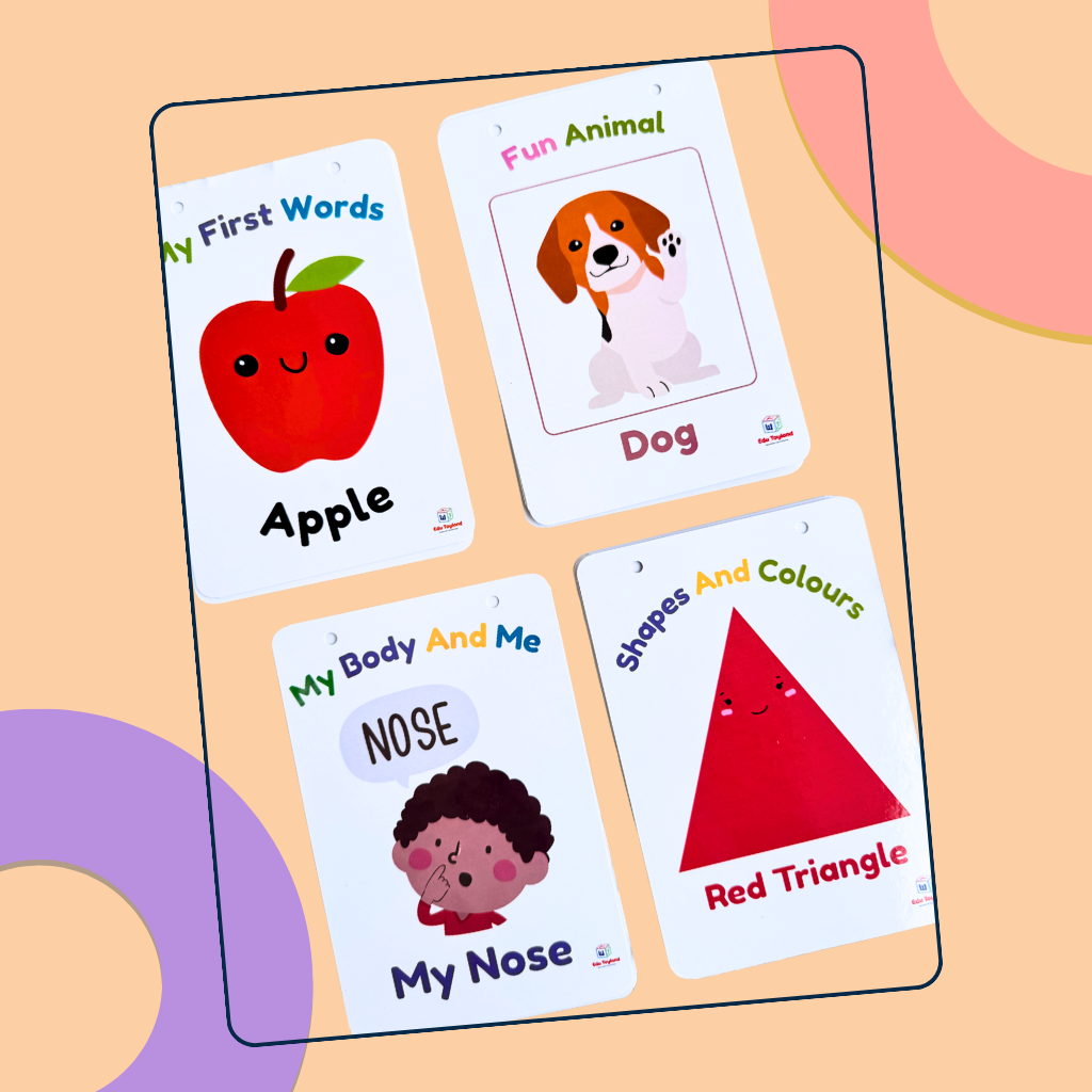 • Built for little hands → sturdy, wipe-clean cards with colorful binder rings.